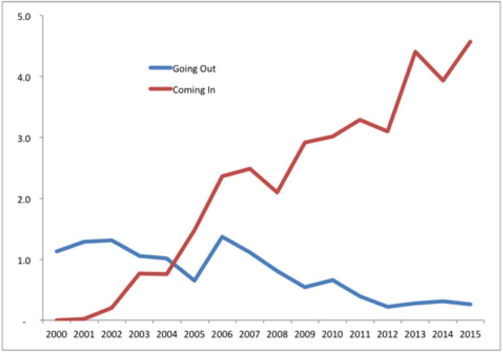 The Fordham organizations seemed to undergo a major change in behavior and focus around 2004–2005, at the start of Checker Finn's second decade at Fordham's helm. While the amount of contributions going out declined, the amount of contributions coming in rose (see Figure 2).